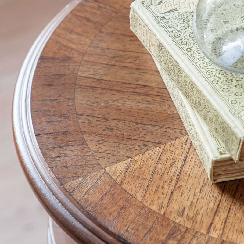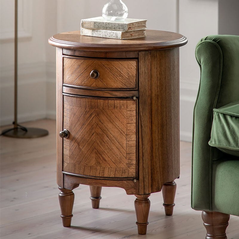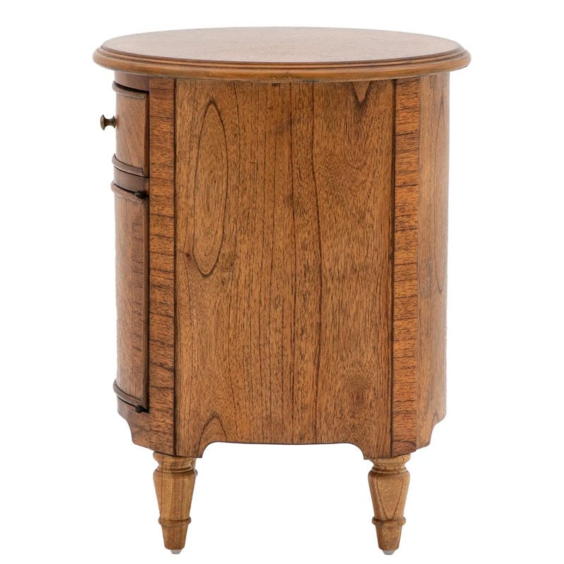 In stunning Mindy wood solids & veneers the beautiful marquetry and inlaid detail of this drum side table is elegantly sophisticated, the bronze beehive pull handles and turned spindle feet adding the final refined finishing touch. Offering a ‘new traditional’ look with a timeless elegant style and a modern touch. A small drawer and cupboard below the table make it a stylish storage solution, perfect for the bedroom or living spaces alike.