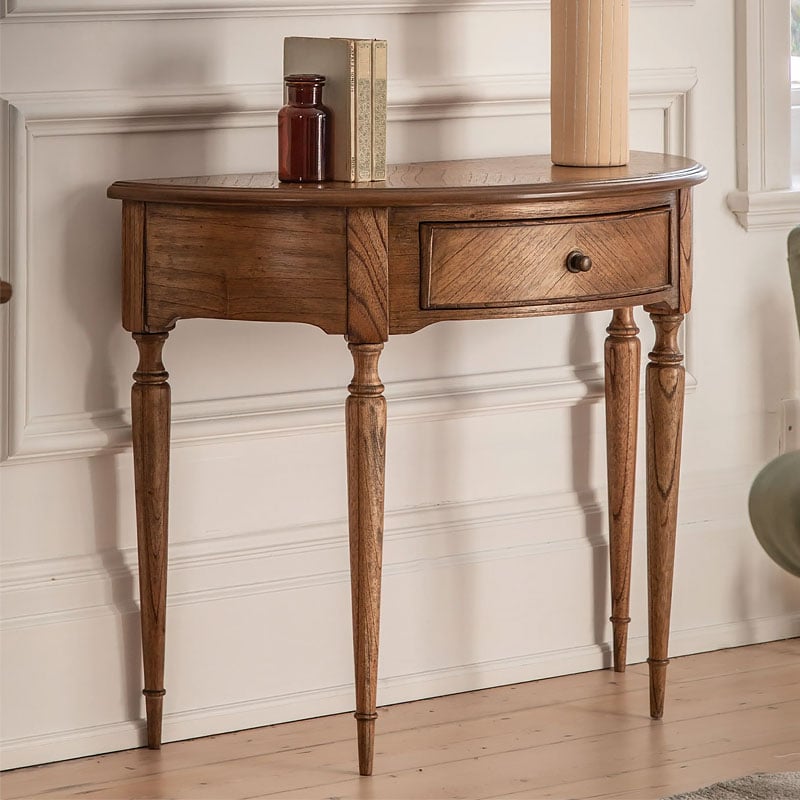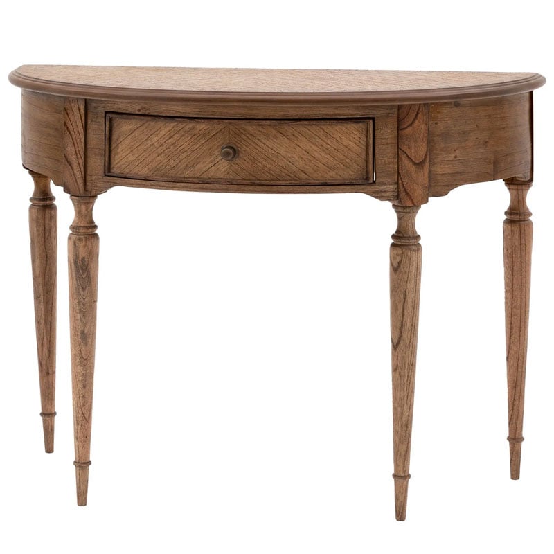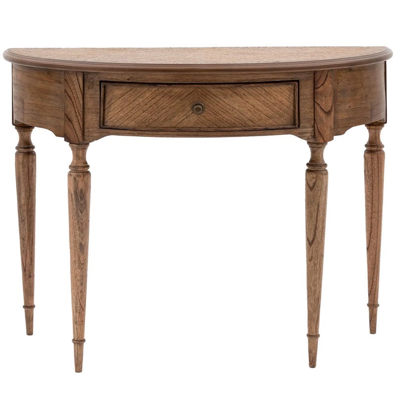 With a sophisticated half-moon shape, this console table is perfectly suited to bedrooms, hallways or any living space where you want to add a timeless elegant style with a modern touch. Offering a ‘new traditional’ look, this stunning console table features beautiful marquetry in exquisite tonal rich brown Mindy wood solids & veneers, with inlaid book-matched details. The bronze beehive drawer pulls and turned spindle legs add the finishing touch.