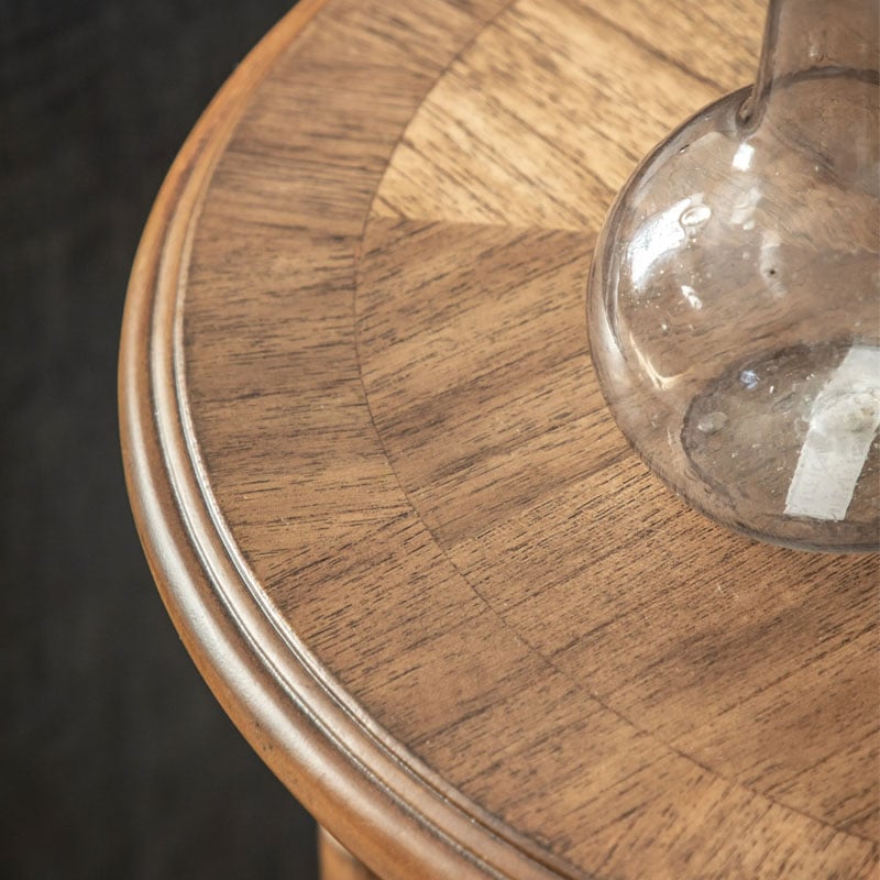 • Offering a ‘new traditional’ look, with its timeless, elegant style with a modern touch, this stunning side table features beautiful rich mid brown Mindy wood solids & veneers with marquetry and inlaid book-matched details.