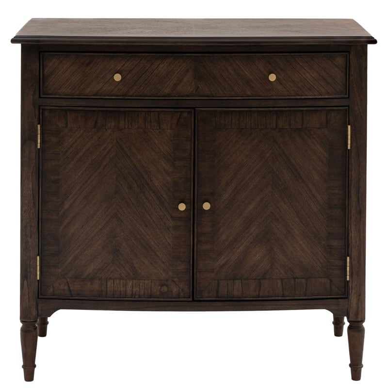 This stunning sideboard features rich coffee brown Mindi wood veneer marquetry and satin brass pull handles, creating a beautiful ‘new traditional’ look. With its timeless, elegant style and a modern touch the 2-door cupboard and 1 drawer make it a practical yet stylish storage solution.