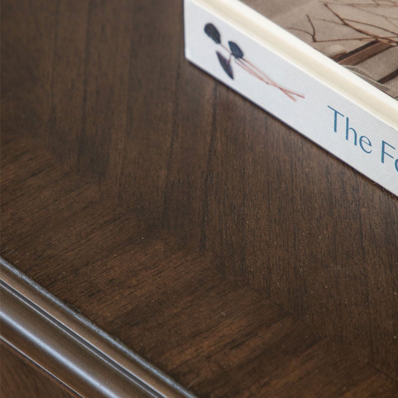 - This stunning sideboard features rich coffee brown Mindi wood veneer marquetry and satin brass pull handles, creating a beautiful ‘new traditional’ look.