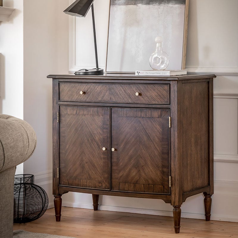 Why we love this Rustic Country Farmhouse Dark Coffee Brown Mindi Wood 1 Drawer 2 Door Cabinet Small Sideboard 100cm