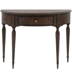 With a sophisticated half-moon shape, this console table is perfectly suited to bedrooms, hallways or any living space where you want to add a timeless elegant style with a modern touch. Offering a ‘new traditional’ look, this stunning console table features beautiful marquetry in exquisite dark coffee brown Mindy wood solids & veneers, with inlaid book-matched details. The satin brass drawer pulls and turned spindle legs add the finishing touch.