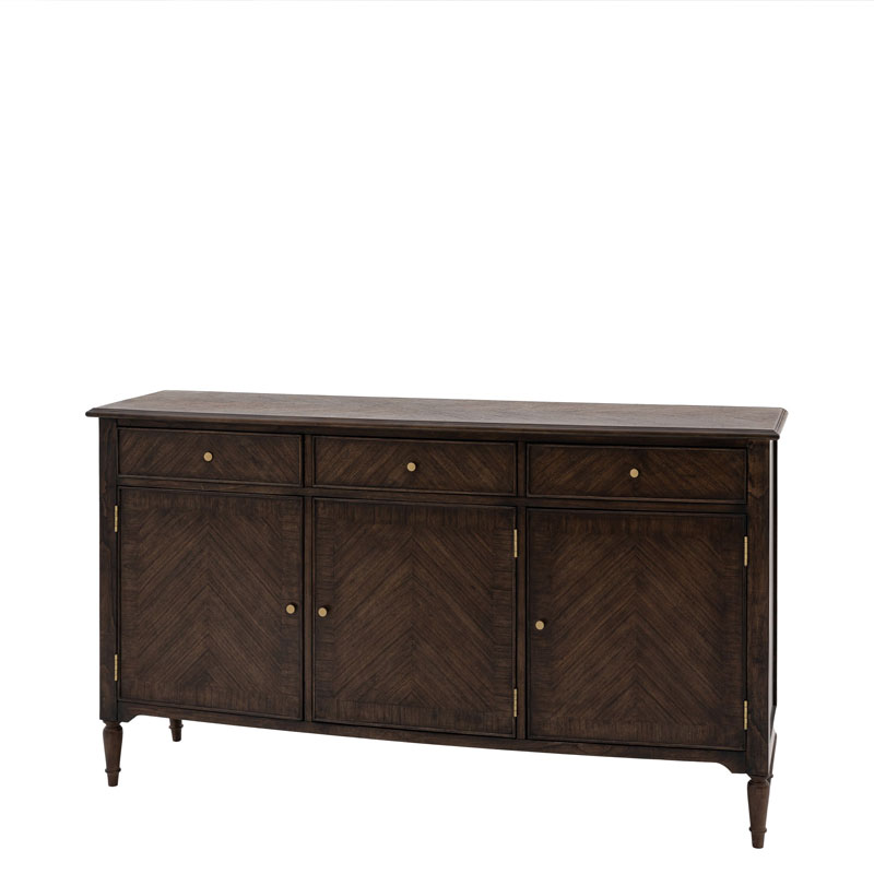 - Featuring beautiful marquetry in exquisite dark salvaged coffee colour Mindy wood veneers, solid wood turned legs and satin brass handle pulls the sideboard offers a ‘new traditional’ look and a touch of timeless, elegant style.