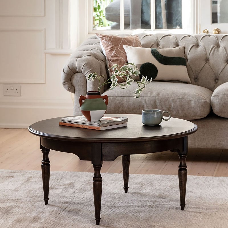 Why we love this Rustic Country Farmhouse Dark Coffee Brown Mindi Wood Round Coffee Table With Hand Carved Legs 90cm