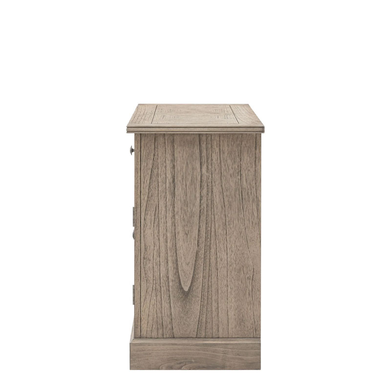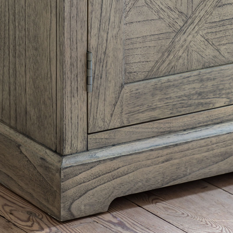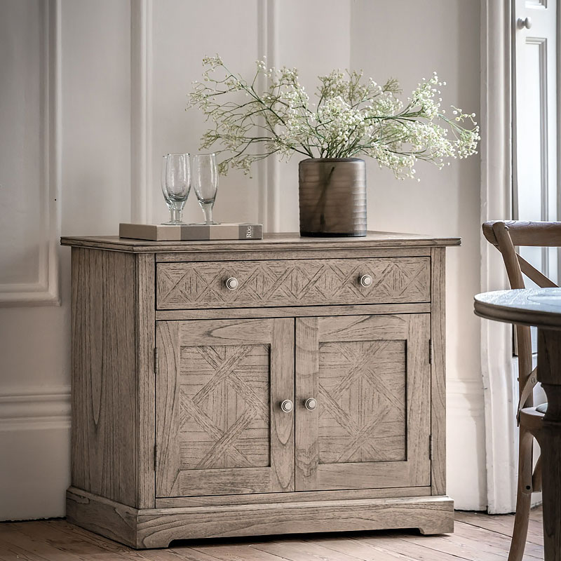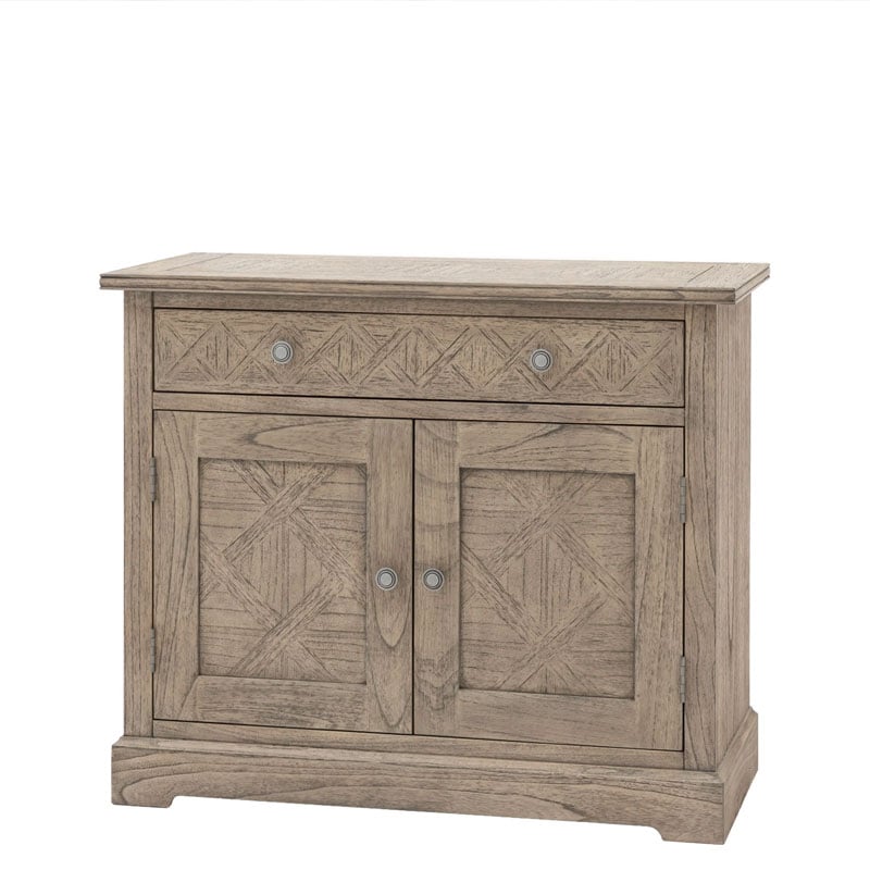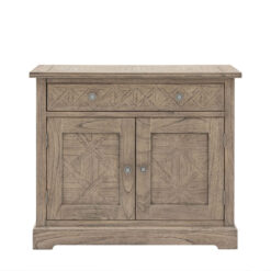 This 2 door sideboard offers a practical storage solution, with its large drawer and cupboard below. The doors, drawer fronts and top feature the signature parquet-style design, with the doors having this as an inset centre panel to add an extra design feature. Crafted from Mindy wood with a stunning inlaid parquet-style design. The lightly brushed finish recreates the natural ageing effect. With its classy design and subtle finish, it offers versatile style that would suit a wide range of interiors.