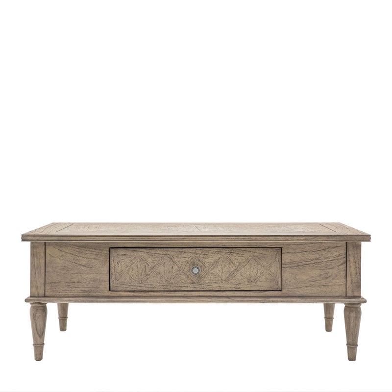 This large coffee table is stylish and practical. The top and drawer front feature the signature parquet-style design, whilst elegant turned legs add a sophisticated finish to the table. Crafted from Mindy wood with a stunning inlaid parquet-style design. The lightly brushed finish recreates the natural ageing effect. With its classy design and subtle finish, it offers versatile style that would suit a wide range of interiors.