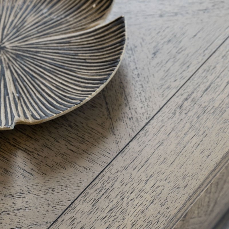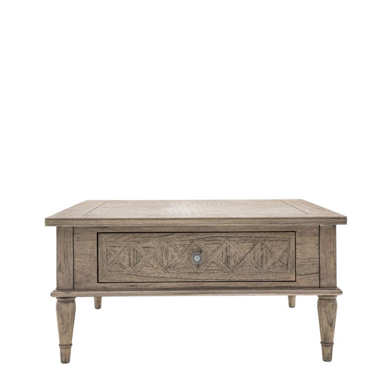 This square 2 drawer coffee table adds practical style to a living room. The two drawers, one on either side of the table, are ideal for helping to keep tidy. The top and drawer fronts feature the signature parquet-style design, whilst elegant turned legs add a sophisticated finish to the table. Crafted from Mindy wood with a stunning inlaid parquet-style design. The lightly brushed finish recreates the natural ageing effect. With its classy design and subtle finish, it offers versatile style that would suit a wide range of interiors.