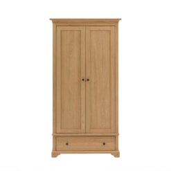 Organise in style with this elegant wooden wardrobe. Featuring a spacious double-door cupboard and a generous lower drawer, the wardrobe offers ample storage alongside timeless style and premium quality. The beautiful natural wood finish, crafted from oak solids and veneers, is full of subtle grain detail and natural beauty. Classic round handles bring a comforting, timeless elegance to the wardrobe, making it a perfect blend of style and practicality, just what any bedroom needs.