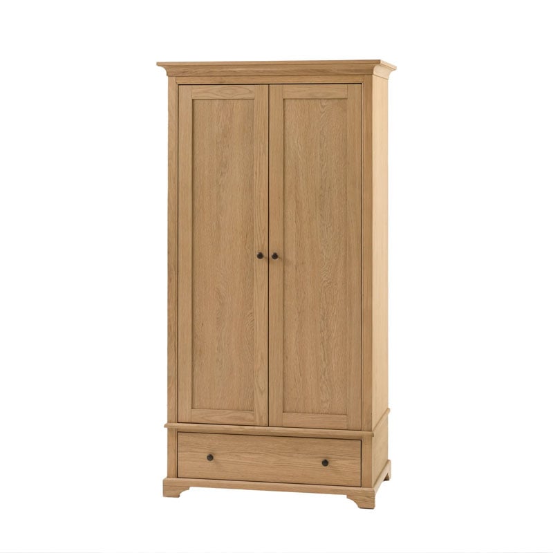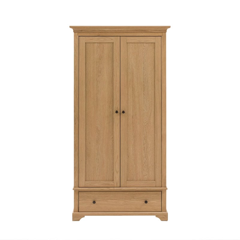 Organise in style with this elegant wooden wardrobe. Featuring a spacious double-door cupboard and a generous lower drawer, the wardrobe offers ample storage alongside timeless style and premium quality. The beautiful natural wood finish, crafted from oak solids and veneers, is full of subtle grain detail and natural beauty. Classic round handles bring a comforting, timeless elegance to the wardrobe, making it a perfect blend of style and practicality, just what any bedroom needs.