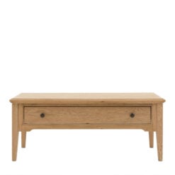 Brighten your living space with this elegantly practical coffee table. Crafted from beautiful oak solids & veneers, full of subtle grain detail and natural beauty, the coffee table features a single spacious drawer, perfect for keeping remotes, magazines, and essentials neatly out of sight. The classic round handles add a touch of timeless charm, making it a beautiful and functional centrepiece for any living space.