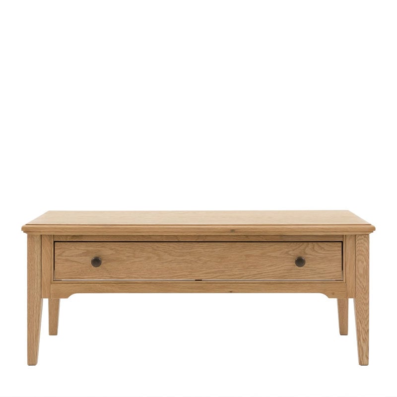 Brighten your living space with this elegantly practical coffee table. Crafted from beautiful oak solids & veneers, full of subtle grain detail and natural beauty, the coffee table features a single spacious drawer, perfect for keeping remotes, magazines, and essentials neatly out of sight. The classic round handles add a touch of timeless charm, making it a beautiful and functional centrepiece for any living space.