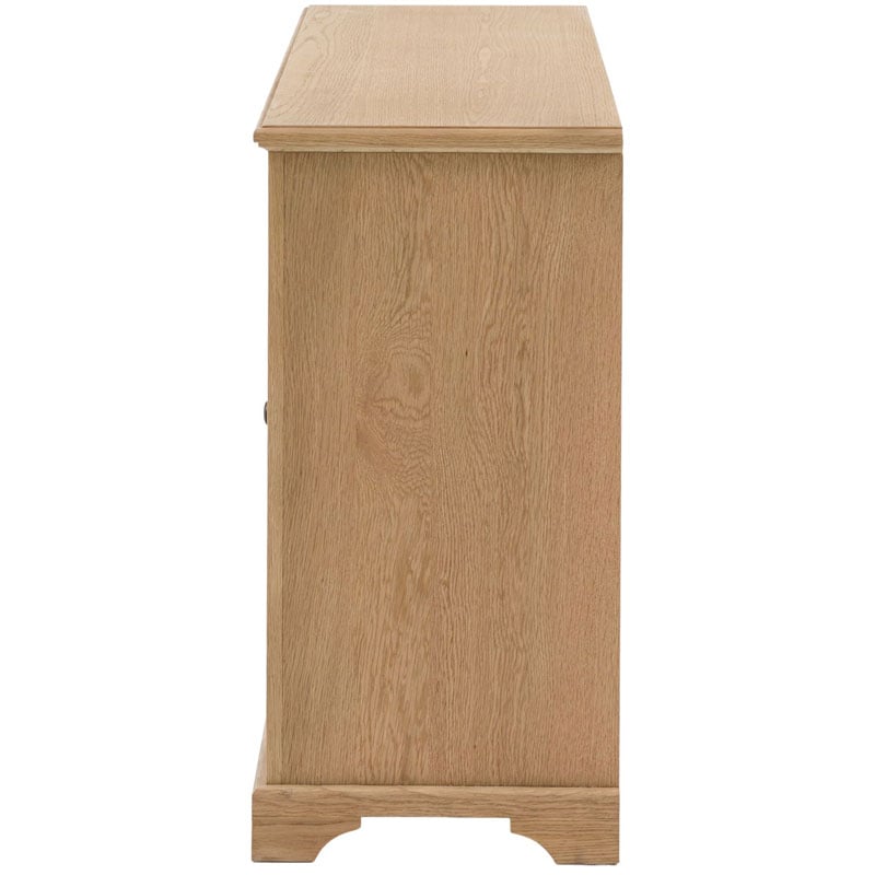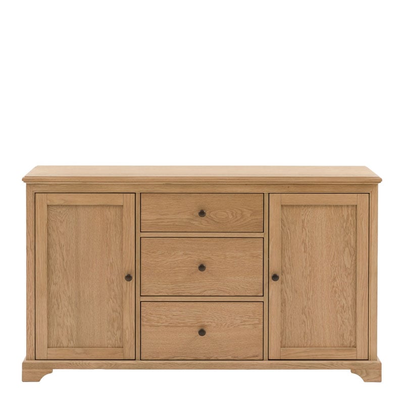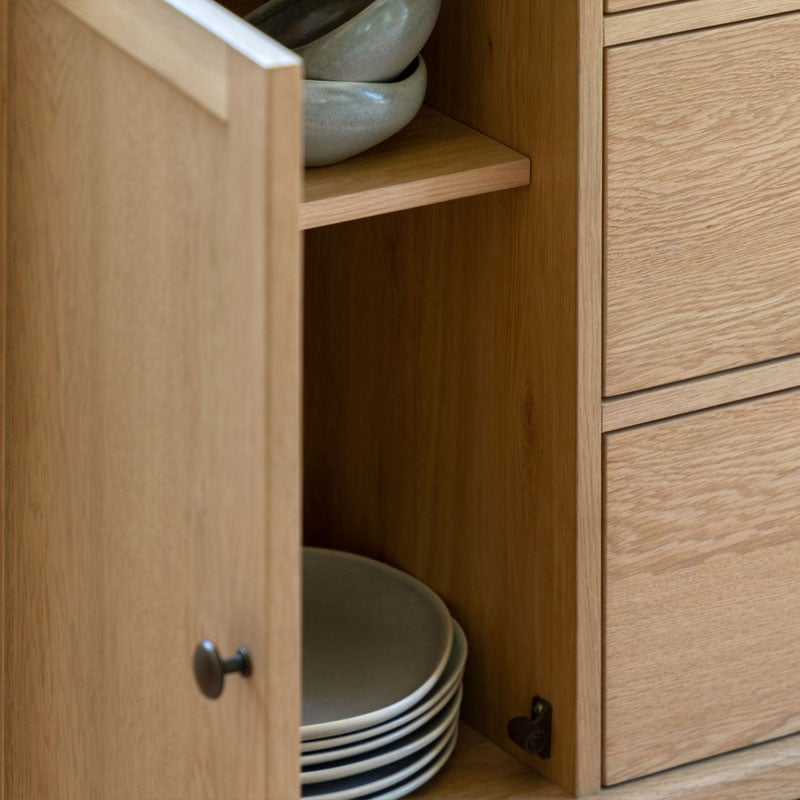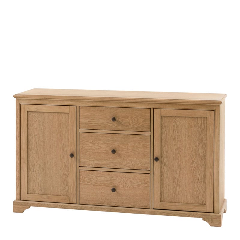Combining timeless design with unparalleled practicality, this sideboard fits perfectly into a wide range of interiors, from traditional to contemporary , Its sideboard is a timeless addition to any space. Ideal for dining rooms, kitchens, or large living areas, the sideboard provides ample storage behind its two doors, alongside three convenient drawers for smaller items. The dark door knobs and drawer pulls perfectly complement the warm tones of the high quality solid oak & veneers, which is full of subtle grains and a warm, natural finish.