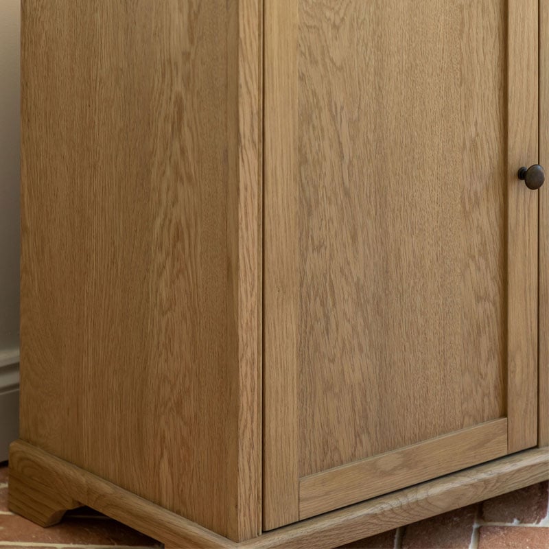 - The dark door knobs and drawer pulls perfectly complement the warm tones of the high quality solid oak & veneers, which is full of subtle grains and a warm, natural finish.