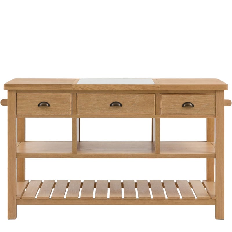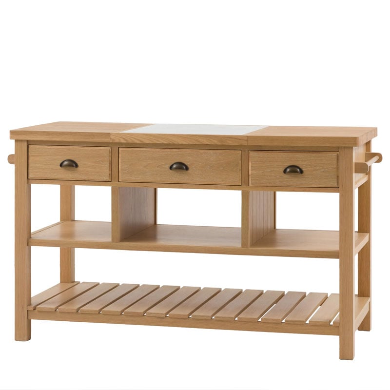 Rustic Country Farmhouse Light Oak Wood 3 Drawer 3 Tier Large Kitchen Island With White Marble Centre Inlay 150cm