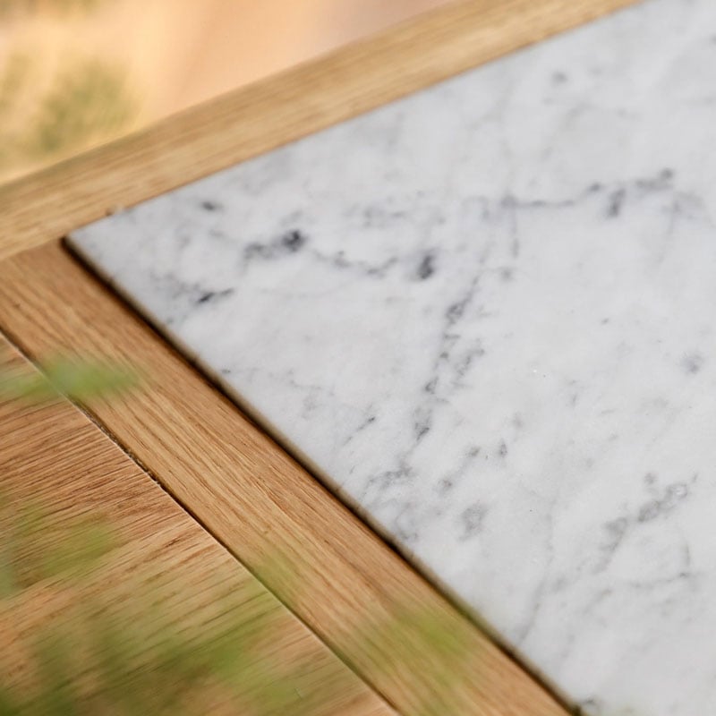 • With country charm and a natural finish, the 3 drawers and shelves, planked lower shelf, and handy hanging rails add practical storage while the wood and marble inlaid top make for the perfect prep surface.