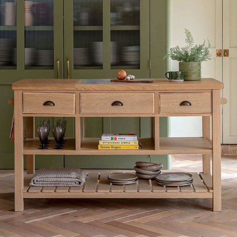 • Add extra space and storage to a kitchen with this traditional inspired kitchen island. Due to the handmade nature of this product, colour variations may be present.