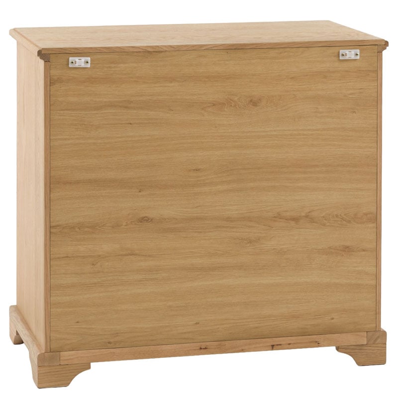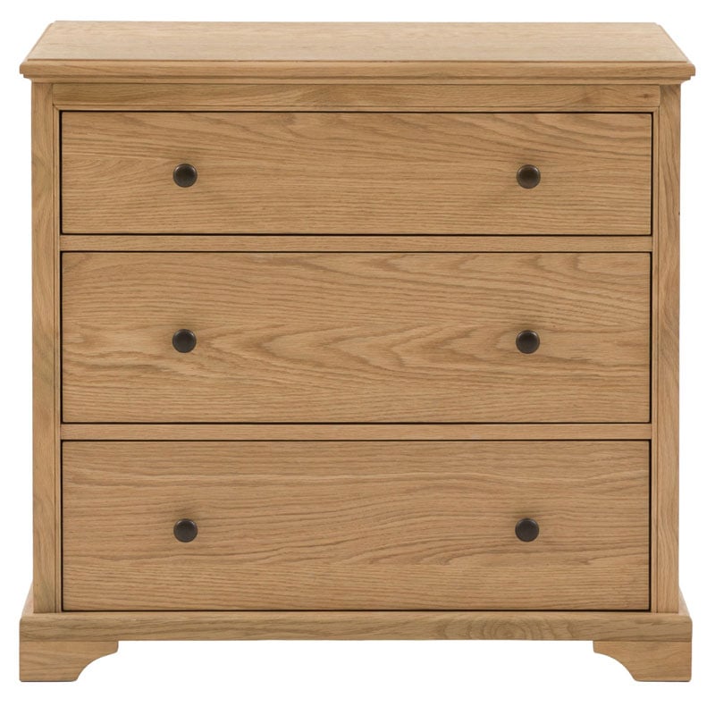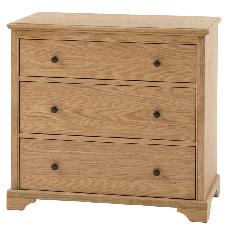 Discover practical elegance with this charming light wood chest of drawers. Crafted with premium solid oak and veneers with a warm natural finish, the chest showcase the natural beauty and grain of wood. The contrasting dark knobs add a classic touch, making this chest a timeless and functional addition to your bedroom, perfect for both traditional and contemporary room schemes. Featuring three spacious drawers providing ample storage.