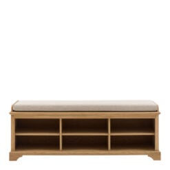 Welcome functionality and style into your home with this versatile hall bench. Perfect for your entryway, the bench features a comfy, natural toned upholstered cushion for seating and six open cubbies, ideal for organising shoes, bags, or other essentials. The wooden frame is crafted in solid oak & veneers, full of subtle grain detail and natural warmth, adding a touch of natural charm to any space.