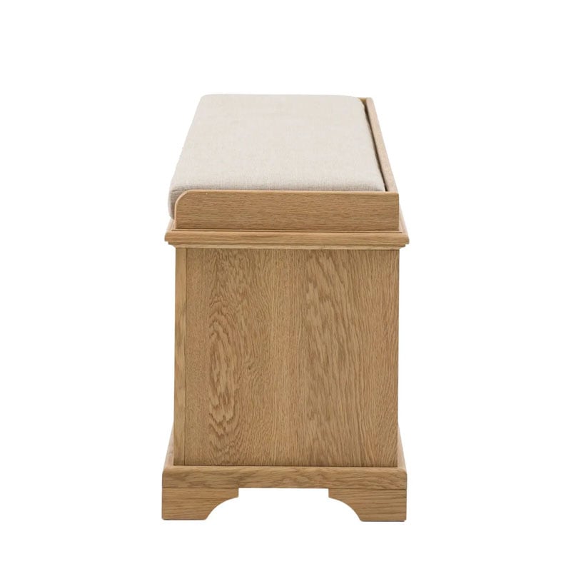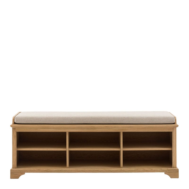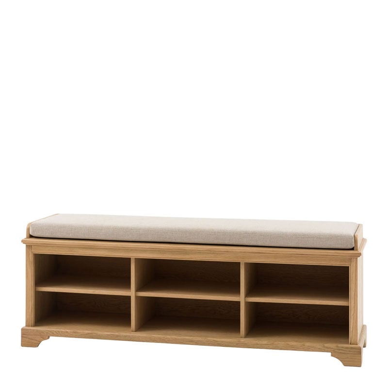 Welcome functionality and style into your home with this versatile hall bench. Perfect for your entryway, the bench features a comfy, natural toned upholstered cushion for seating and six open cubbies, ideal for organising shoes, bags, or other essentials. The wooden frame is crafted in solid oak & veneers, full of subtle grain detail and natural warmth, adding a touch of natural charm to any space.