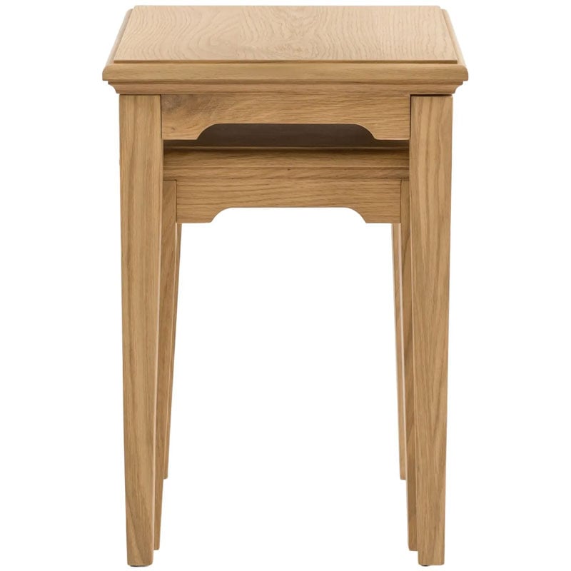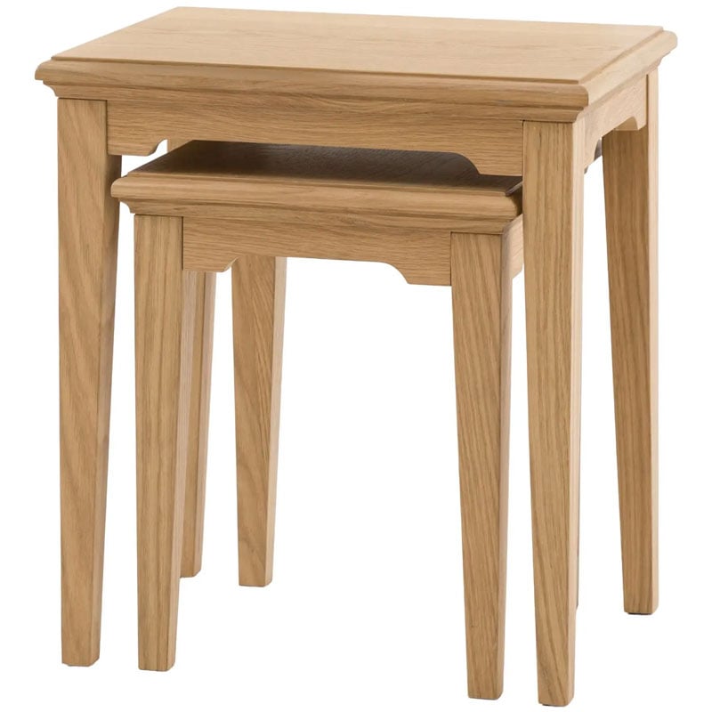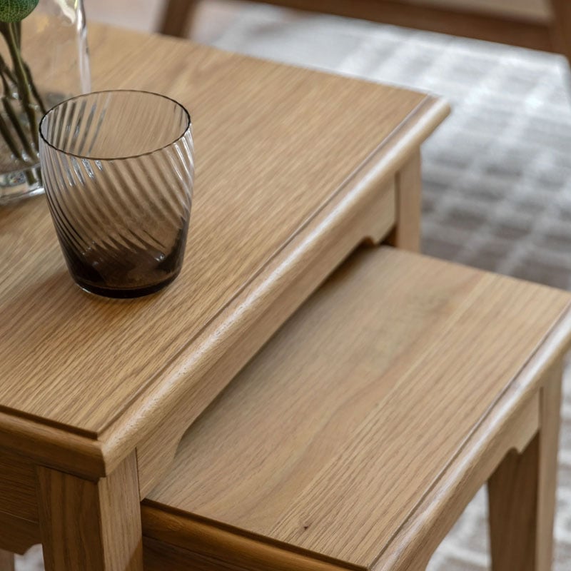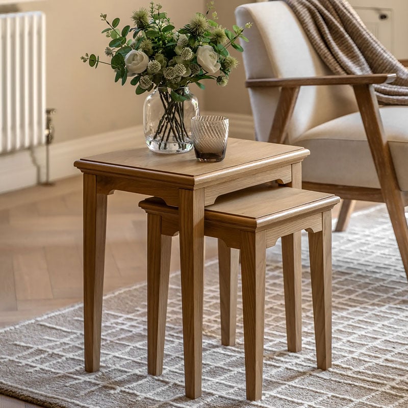 Maximise your living space with this charming wooden nest of tables. Perfect for smaller rooms or simply creating an adaptable living space, these two tables can be used together as a multi-tiered stack or separately as a pair of convenient side tables. The warm, natural oak solid & veneers are full of subtle grains, adding a touch of rustic elegance and timeless style, offering both natural beauty and remarkable versatility.