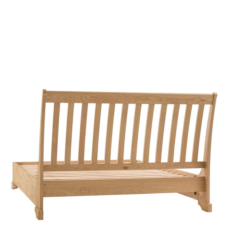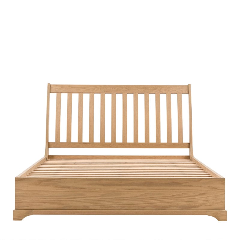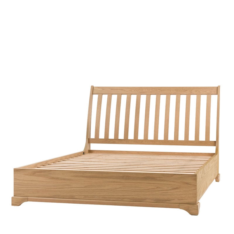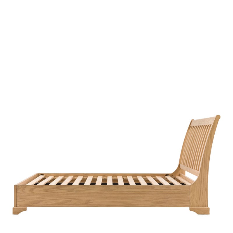 Create the perfect sleep sanctuary with this beautifully crafted wooden double bed frame. The elegant, clean lines and beautiful natural wood finish, crafted with premium solid oak and veneers, exudes timeless style, seamlessly blending into both modern and traditional bedrooms. The supportive slatted headboard offers a comfortable backrest, designed for comfort and lasting beauty.