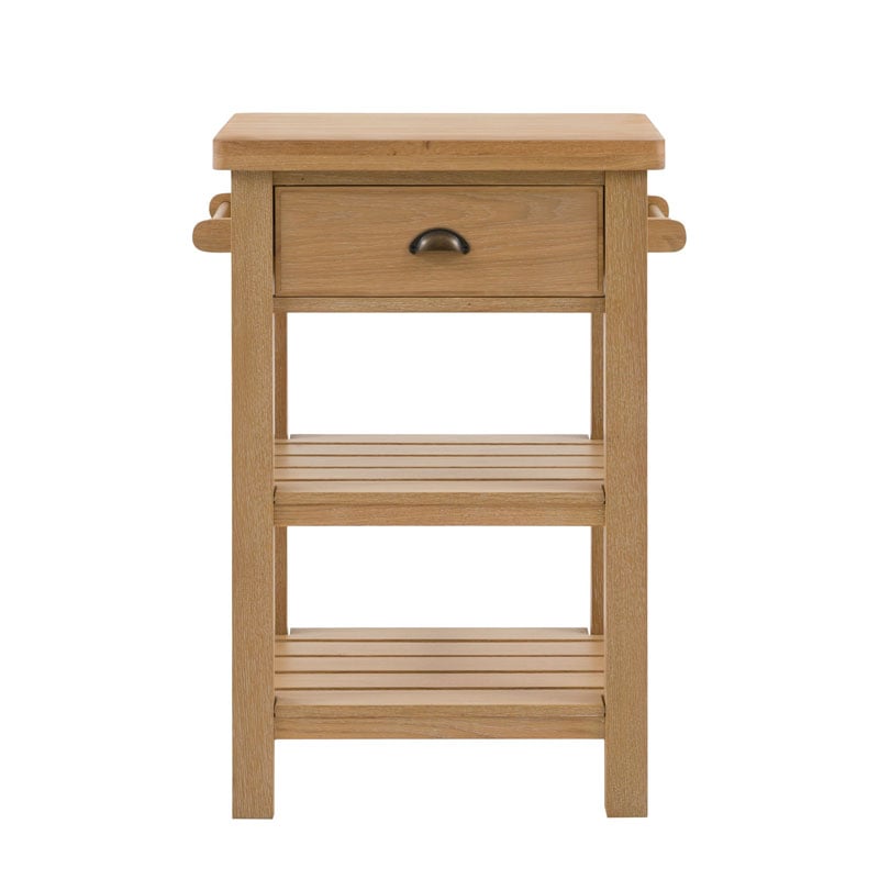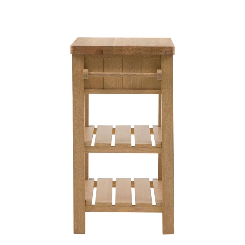 - With a solid oak top sturdy enough for daily use, 2 shelves, handy hanging rails and a drawer, this butcher’s block is a practical addition to any kitchen.
