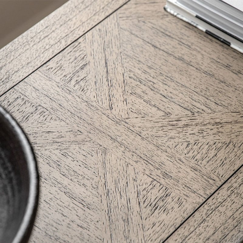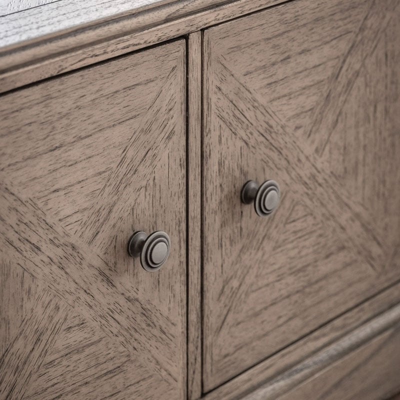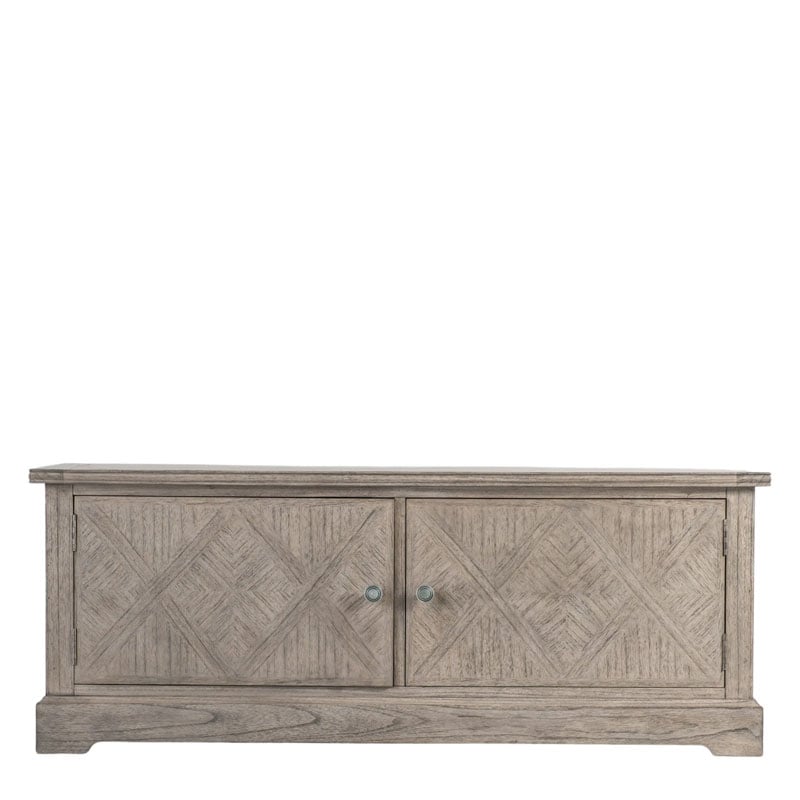 This 2 door media unit offers a practical storage solution, and is ideal as a media unit or for general use. The doors and top feature the signature parquet-style design. Crafted from Mindy wood with a stunning inlaid parquet-style design. The lightly brushed finish recreates the natural ageing effect. With its classy design and subtle finish, it offers versatile style that would suit a wide range of interiors.