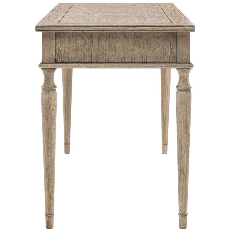 With its beautiful inlaid parquet design and elegant turned legs, this 2 drawer desk oozes effortless style and appeal. Made from Mindy wood which is lightly brushed to recreate a natural ageing effect, its subtle finish and classy design suits a range of interiors. The 2 drawers add practical storage, to help keep tidy. Crafted from Mindy wood with a stunning inlaid parquet-style design. The lightly brushed finish recreates the natural ageing effect. With its classy design and subtle finish, it offers versatile style that would suit a wide range of interiors.