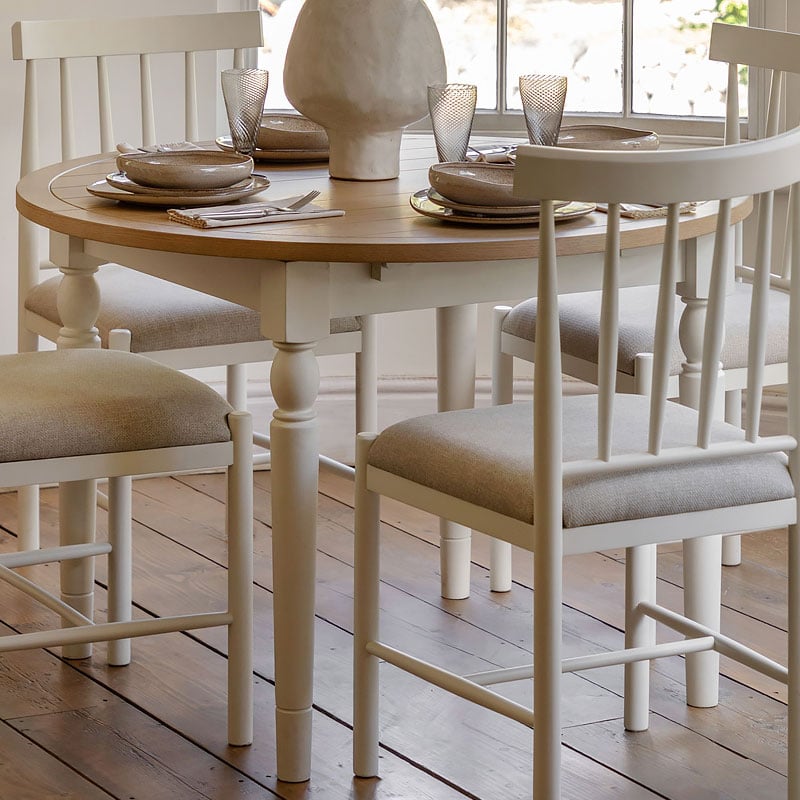 Why we love this Rustic Country Farmhouse Soft White And Light Wood Extending 4 – 6 Seater Round Dining Table