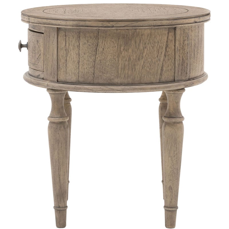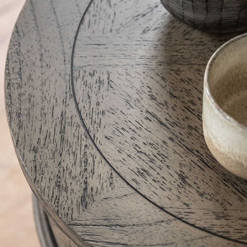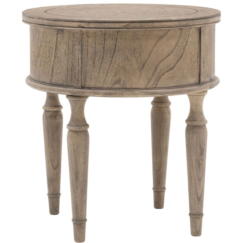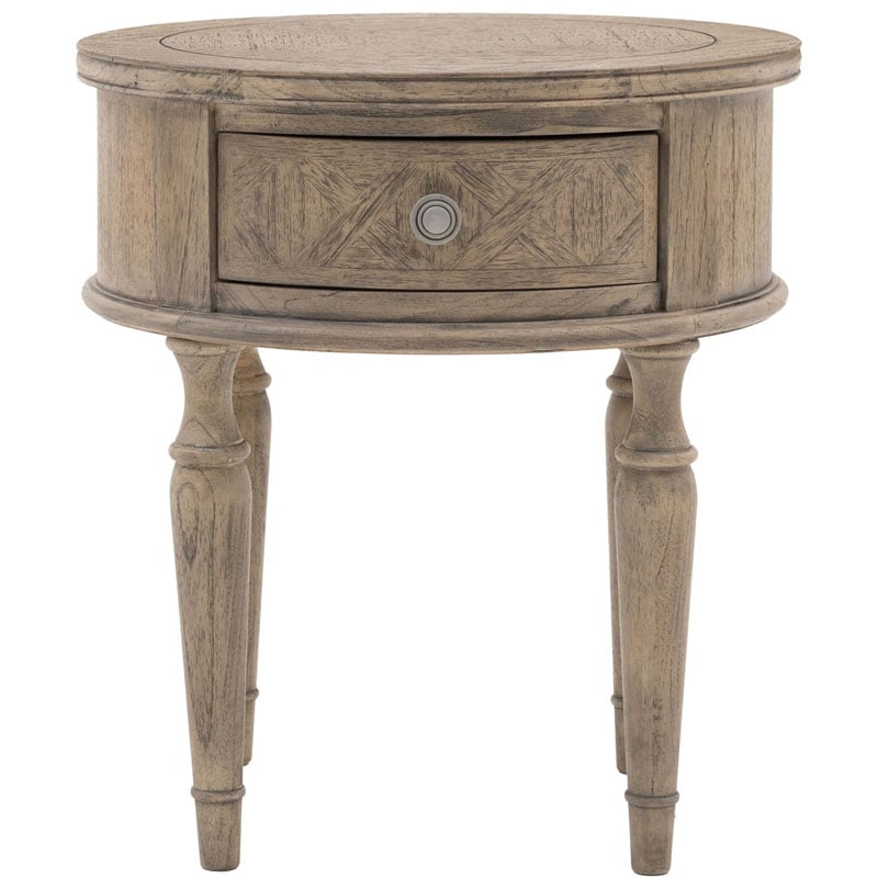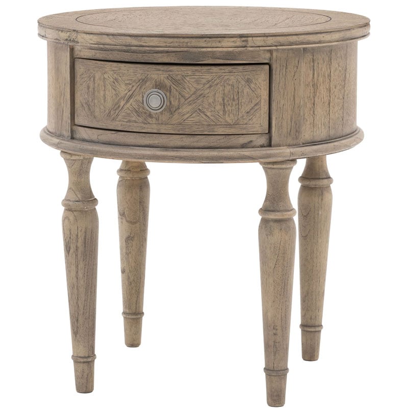 This round bedside cabinet side table offers a practical storage solution, with its large drawer. The drawer front and top feature the signature parquet-style design. Crafted from Mindy wood with a stunning inlaid parquet-style design. The lightly brushed finish recreates the natural ageing effect. With its classy design and subtle finish, it offers versatile style that would suit a wide range of interiors.