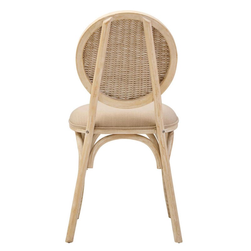 Rustic French Country Bistro Rattan Cane And Solid White Washed Elm Wood Dining Chair With Natural Fabric Upholstered Seat