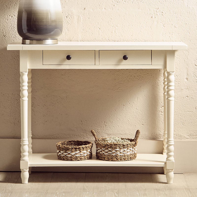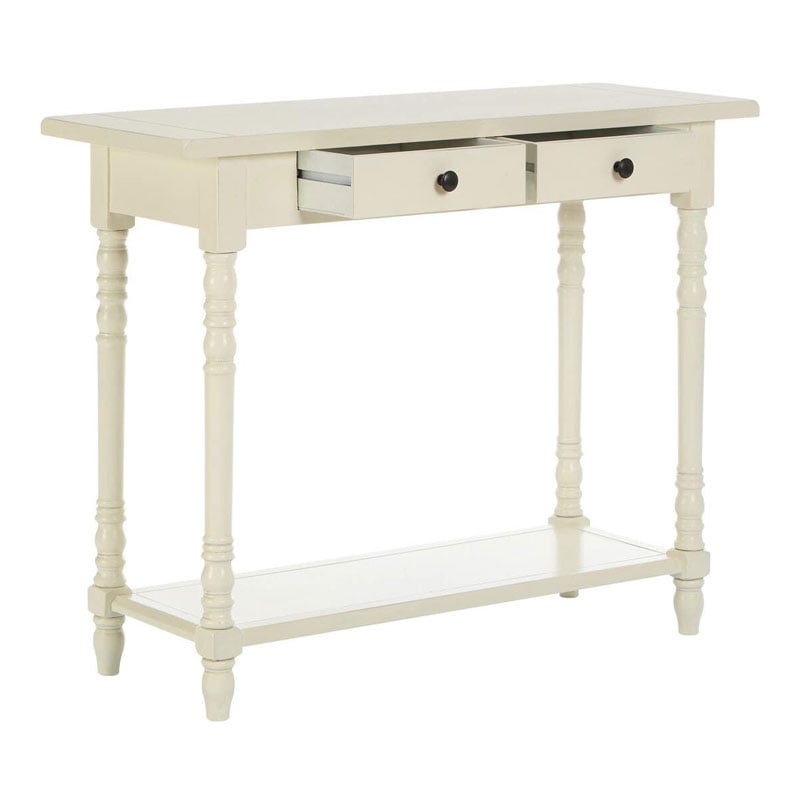 Why we love this Rustic Ivory White Pine Wood 2 Tier 2 Drawer Slim Console Table With Turned Legs