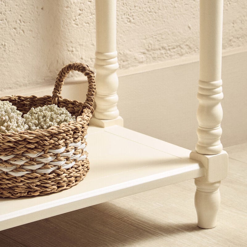 - This slim console table is crafted from natural wood and finished in an ivory tone.