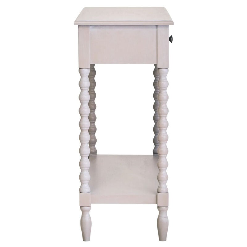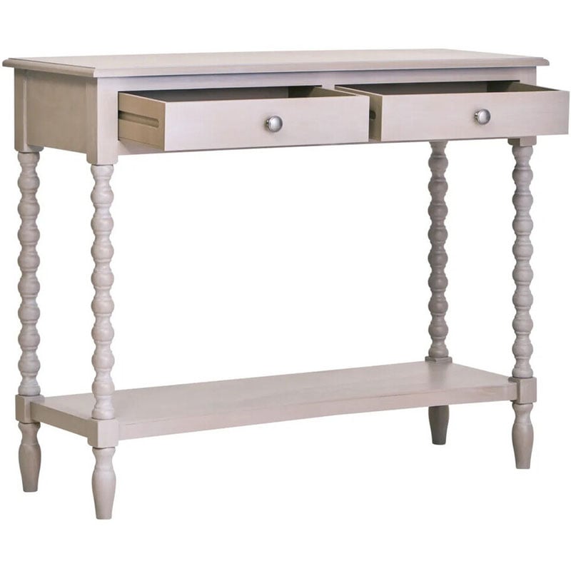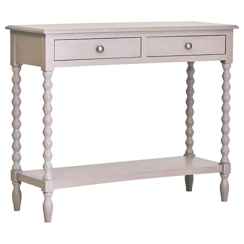 This grey wood console table has vintage-inspired bobble legs and two drawers for convenient storage, a stylish choice for any living space. This two-drawer console table combines traditional charm with modern functionality. The table features bobble detail, offering a sculptural element to the design. The grey finish and two drawers with antique handles provide storage for keeping essentials, while the lower shelf offers space for decorative items, making it perfect for any interior.