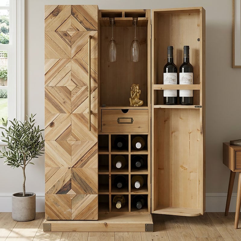 A distinguished addition to any home, this Rustic Marquetry Style Solid Light Fir Wood Wine Bar Drinks Cabinet With Gold Metal Door Handles is crafted from solid fir wood, combining classic elegance with practical design. Its spacious interior provides room for your favourite bottles, while the subtly detailed doors and clean lines offer timeless appeal. Ideal for a living room, dining area, or snug corner, this cabinet blends functionality with heritage charm, creating a quiet focal point in your home.