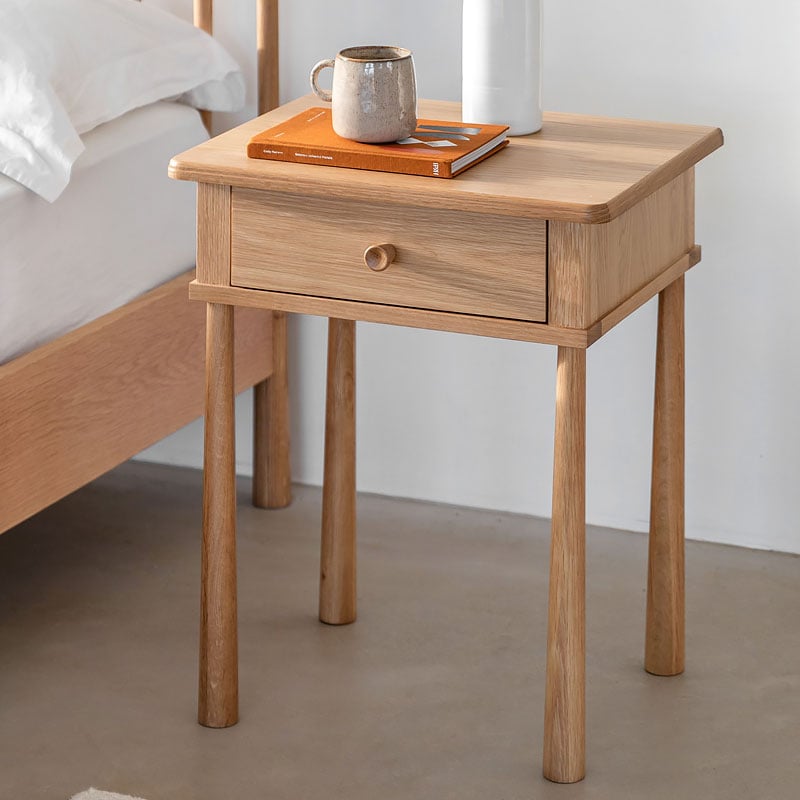 This 1 drawer rustic scandi japandi bedside cabinet side table is made from a combination of the finest solid oak and veneers creating the contemporary aesthetic colour palette that is the essence of Nordic style.