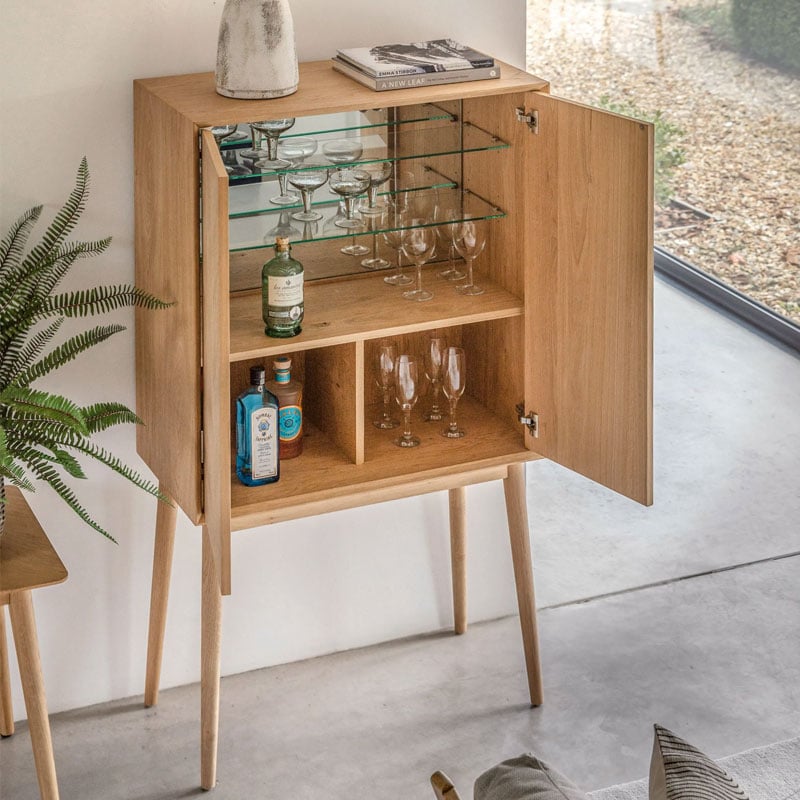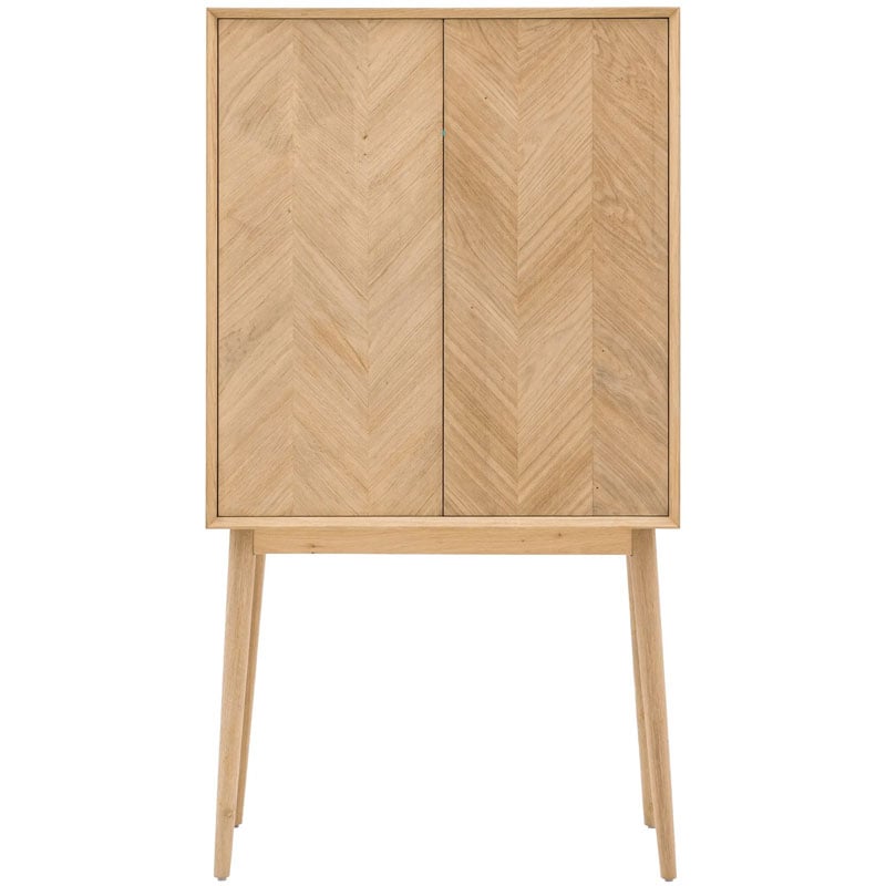 Cool and sleek this 2 door cocktail cabinet features a beautiful inlay chevron design, and is made using European oak and rustic oak structured veneers which show the natural beauty of the oak grain and knots. Finished in a specialist mat lacquer, which keeps the timber looking natural and dry, with brushed out grain, the cabinet is tactile to the touch and looks amazing. Flush finish doors show the stylish chevron pattern and the true beauty of the oak. Internally, the bottom part of the cabinet is wood and there is a wooden shelf. Above this the cabinet has a mirrored back and 2 glass shelves.
