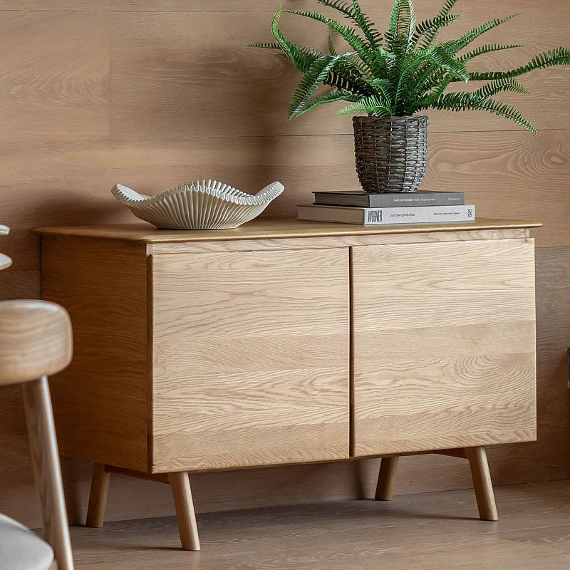 This 2 door sideboard is a stylish and functional addition to any room, inspired by mid-century modern design. This sideboard features two spacious doors that provide ample storage space for your belongings. The clean lines and tapered legs create a minimalist and modern look, while the natural wood finish adds warmth and character to any room. Perfect for use in the living room, dining room, or hallway.