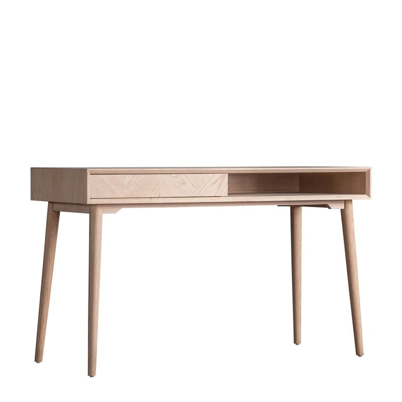 An eye-catching inlay chevron design, combined with a specialist mat lacquer finish to keep the timber looking natural and dry with brushed out grain, gives this desk a tactile appeal. Made using European oak and rustic oak structured veneers which show the natural beauty of the oak grain and knots, this stunning piece, with a single drawer and open storage compartment, offers both style and practicality.