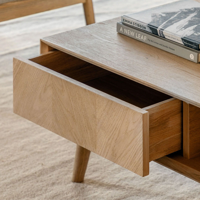 An eye-catching inlay chevron design, combined with a specialist mat lacquer finish to keep the timber looking natural and dry with brushed out grain, gives this 2 tier 2 drawer coffee table a tactile appeal. Made using European oak and rustic oak structured veneers which show the natural beauty of the oak grain and knots, this stunning piece, with two drawers and 2 open storage compartments, offers both style and practicality.