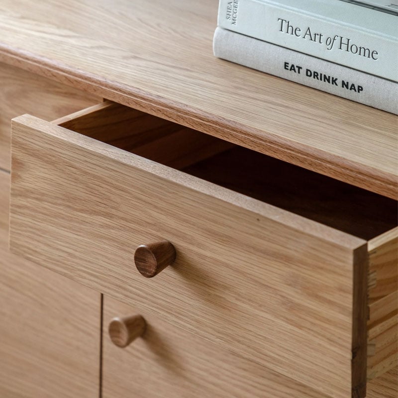 This 3 drawer 3 door rustic scandi japandi sideboard is made from a combination of the finest solid oak and veneers creating the contemporary aesthetic colour palette that is the essence of Nordic style.