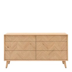 Cool and sleek this 6 Drawer chest features a beautiful inlay chevron design, and is made using European oak and rustic oak structured veneers which show the natural beauty of the oak grain and knots. Finished in a specialist mat lacquer, which keeps the timber looking natural and dry, with brushed out grain, the drawers are tactile to the touch and look amazing. Flush finish drawers show the stylish chevron pattern and the true beauty of the oak.