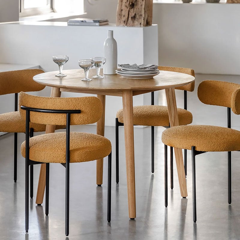 Why we love this Rustic Scandi Japandi Light Oak Wood Chevron Top 4 Seater Round Dining Table