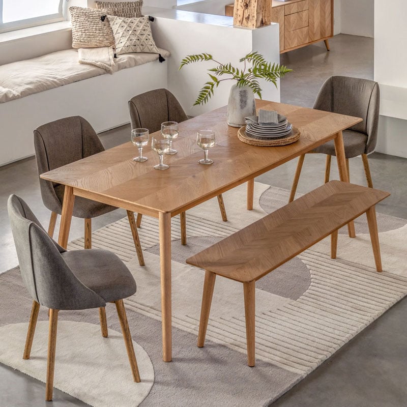 Why we love this Rustic Scandi Japandi Light Oak Wood Chevron Top 8 Seater Extending Dining Table