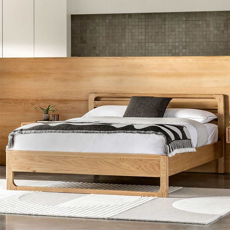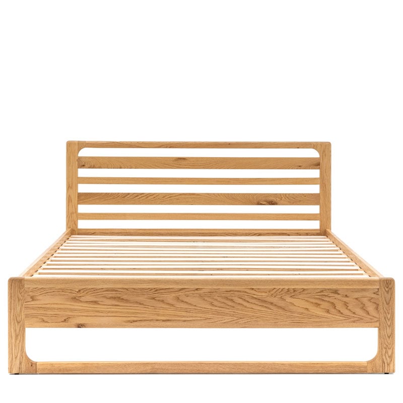 Rustic Scandi Japandi Light Oak Wood Double Bed Frame With Slatted Headboard