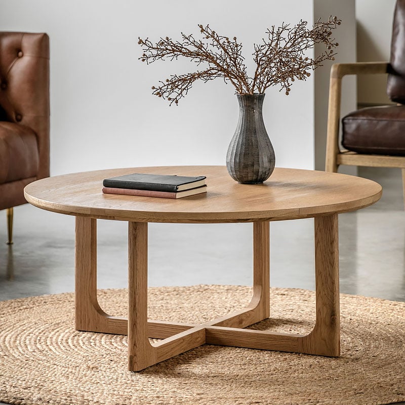 Crafted from the finest oak and structural oak veneers where practical, this beautiful coffee table offers elegant design, with its simple round top and beautifully shaped underframe. The wood has a lovely natural finish.