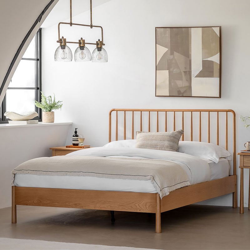 This spindle headboard rustic scandi japandi king size bed frame is made from the finest solid oak creating the contemporary aesthetic colour palette that is the essence of Nordic style.