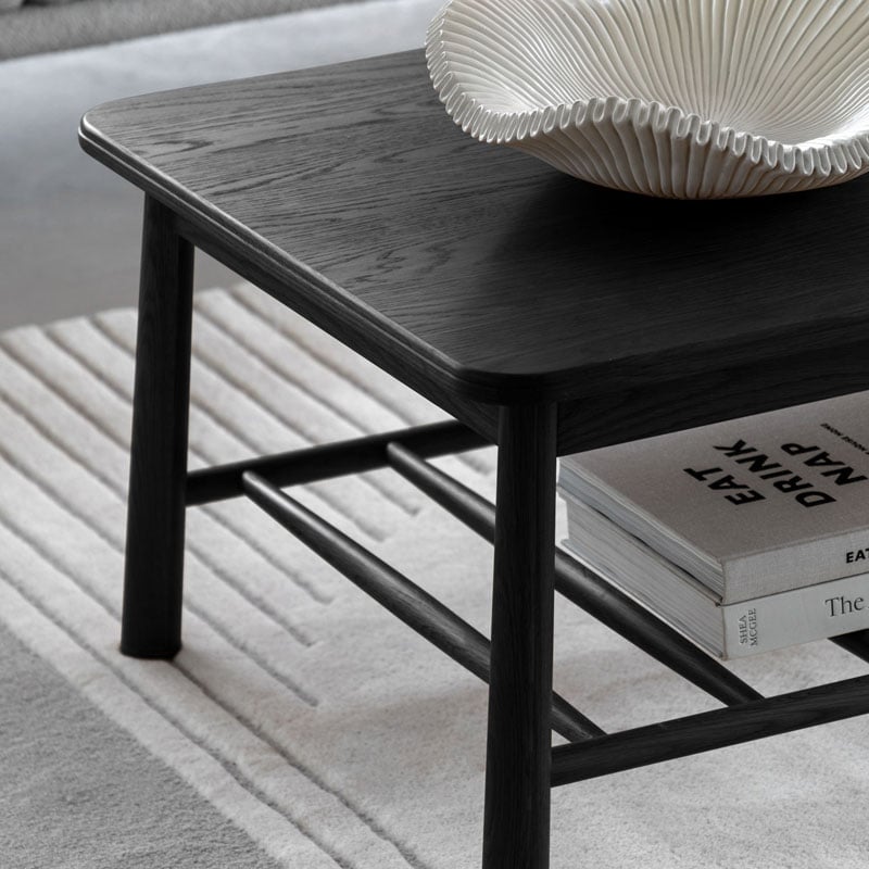 This 2 tier spindle lower shelf rustic scandi japandi rectangular large coffee table is made from the finest solid black oak creating the contemporary aesthetic colour palette that is the essence of Nordic style.