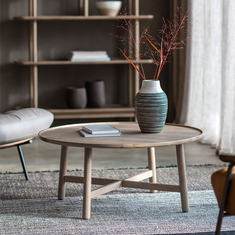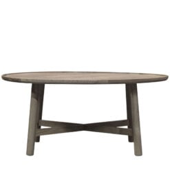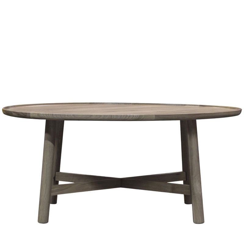 - A round coffee table made using solid European Oak in a grey dry sheen level finish.